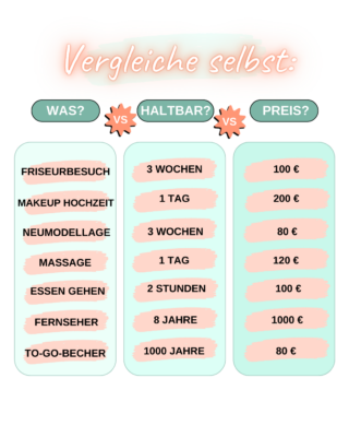 - Ein Hochzeits-MakeUp für 200€? Hält vielleicht 1 Tag. Nachhaltigkeit gleich Null.