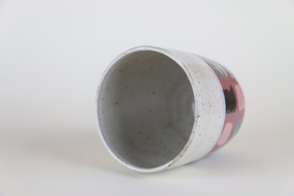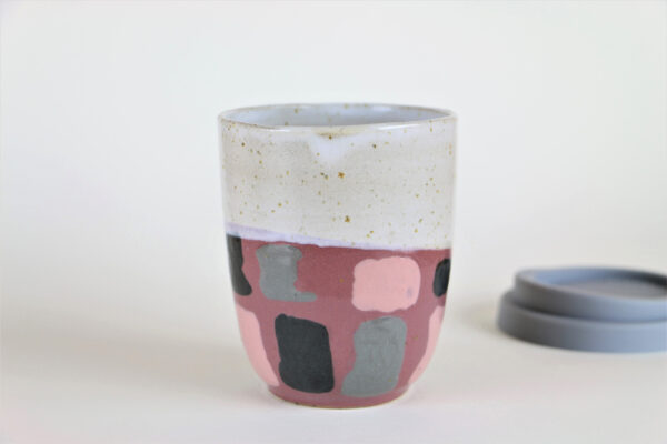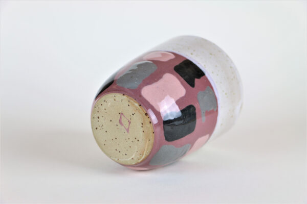Beere, Rosa, Grau, Schwarz und Weiß bilden hier eine sehr harmonische Farbzusammenstellung, die noch lebendiger wird durch die vielen kleinen Spots des Tons, die durch die weiße Glasur scheinen. Eine angenehme Form, die vorteilhaft ist für Becherhalterungen im Auto, rundet die Gesamterscheinung von „Spotty Purple“ ab.