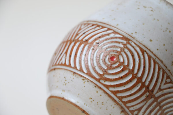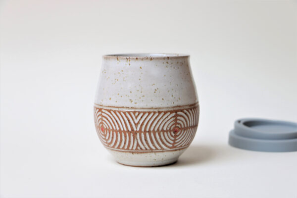 Ein großer Vertreter meiner zahlreichen gekerbten und glasierten Becher. Er besticht durch die Einfachheit seines Designs, denn hier wurde – bis auf den kleinen Punkt in der Mitte – nur eine Glasur verwendet, die in schönem Kontrast steht zur reinen Tonfarbe der gekerbten Wellen. Die Kerben in der Mitte sind unglasiert, regen sie die Finger zum Nachfühlen an und bieten einen guten Halt. Durch seine harmonische runde Form liegt der Becher gut in der Hand und bietet viel Platz.