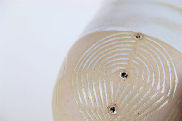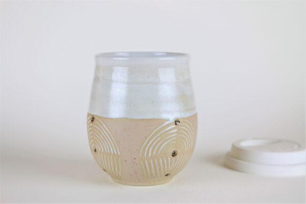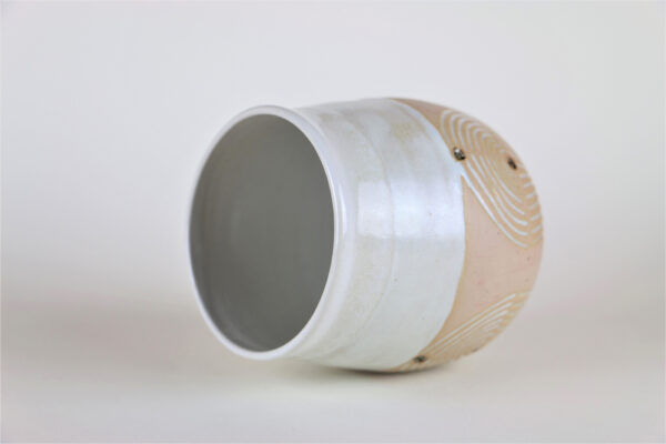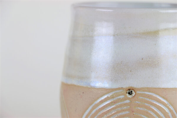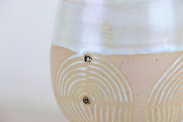 Ein ganz prachtvolles Exemplar unter all meinen Unikatbechern ist die herrliche Wüstensonne. Den Namen haben meine Follower auf Instagram ausgesucht und ich muss sagen, dass er sehr gut passt zu den Farben und dem Design. Dieser schöne Unikatbecher ist ein Einzelstück und der Erste, an dem ich ein selbstgefärbtes Rosa, die cremefarbene Glasur und die Kerbtechnik zusammen ausprobierte.