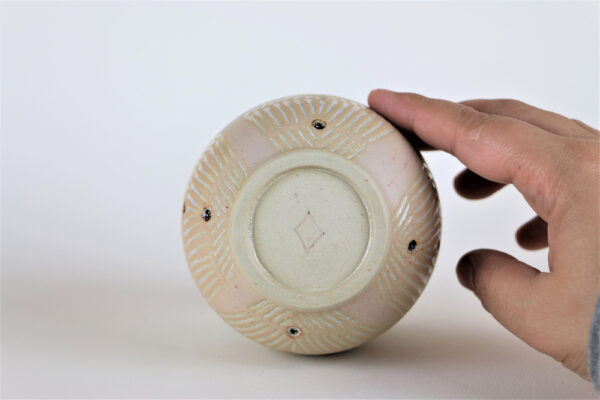 Das Highlight an der „Wüstensonne“ ist sicher die gekerbte `aufgehende Sonne´ in hellgelb vor dem zartrosa Hintergrund, der an Wüstensand im Morgengrauen erinnert. Die weiße Glasur mit ihrer unregelmäßigen Färbung und den feinen Kristallen erinnert wiederum an Frühnebel.